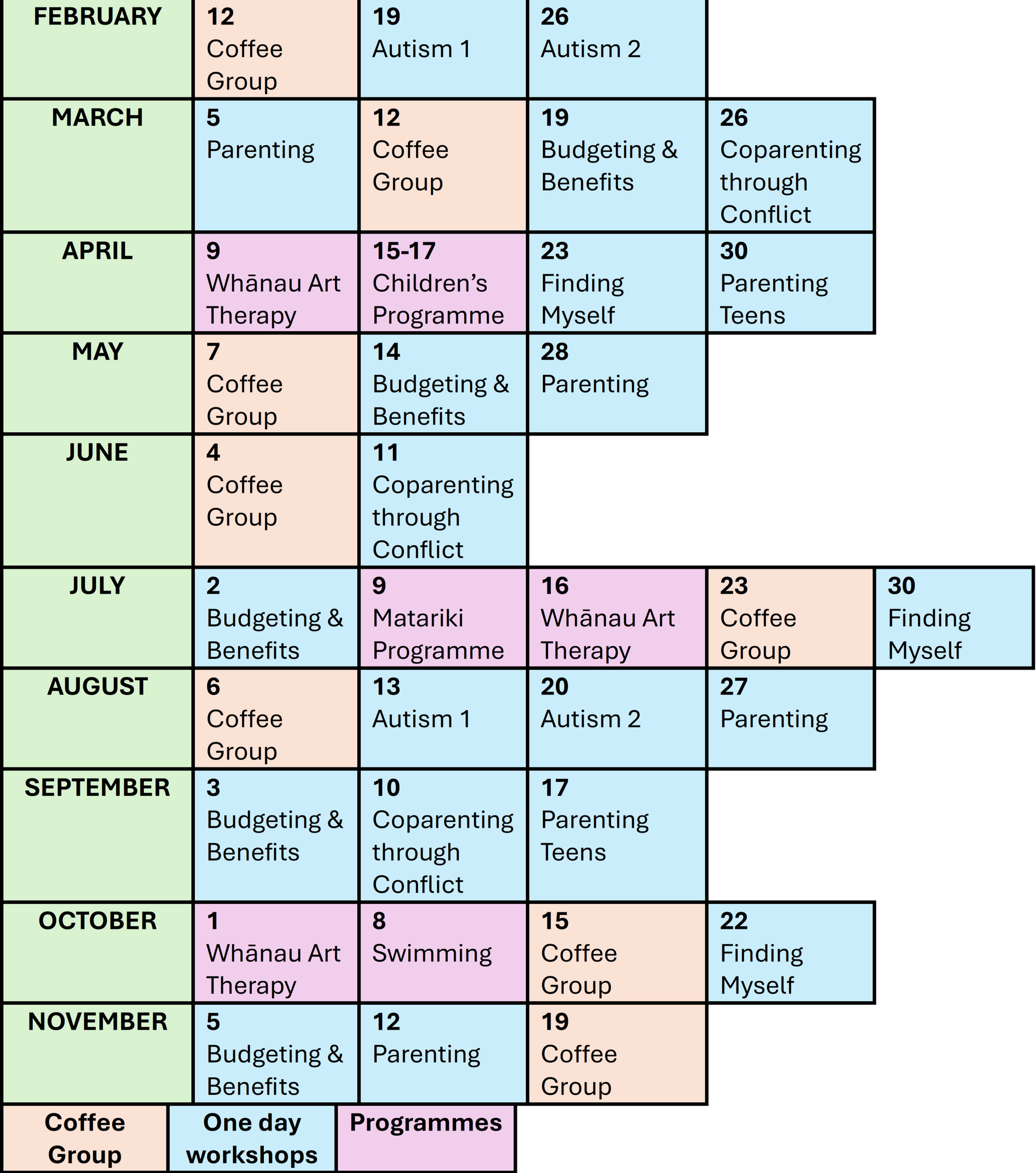 | Kaiawhina | Our Kaiawhina works to enhance general wellbeing, plus help with things like completing forms and connecting with community. She also hosts a regular coffee open to anyone who would like to meet with others on the same journey. |